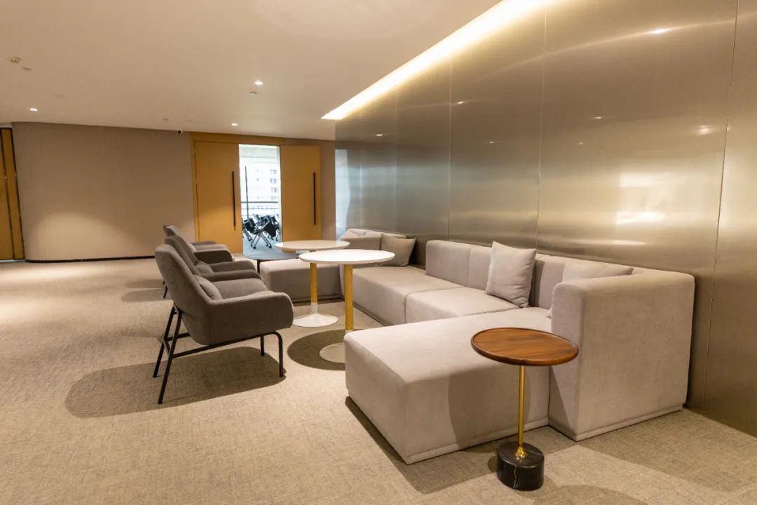沒(méi)有鮮艷的色調(diào),摒棄傳統(tǒng)辦公空間所青睞的金碧輝煌風(fēng),改用棕色座椅搭配著灰白色地毯,咖色沙發(fā)搭配棕紅色背景墻,慢慢過(guò)渡的色彩讓整個(gè)空間更加柔和、干凈和高雅,無(wú)論是辦公還是社交,都能給人提供一個(gè)有溫度的空間,讓科創(chuàng)er的工作和生活連結(jié)地更加融洽。