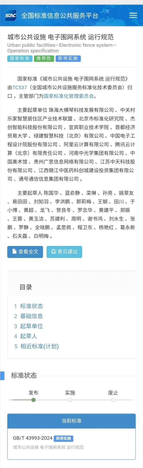 2024年4月25日,國(guó)家市場(chǎng)監(jiān)督管理總局、國(guó)家標(biāo)準(zhǔn)化管理委員會(huì)批準(zhǔn)發(fā)布《中華人民共和國(guó)國(guó)家標(biāo)準(zhǔn)公告》(2024年第6號(hào)),其中序號(hào)318項(xiàng)為由珠海大橫琴科技發(fā)展有限公司(以下簡(jiǎn)稱大橫琴科技公司)主導(dǎo)制定的GB/T 43993-2024《城市公共設(shè)施 電子圍網(wǎng)系統(tǒng) 運(yùn)行規(guī)范》。