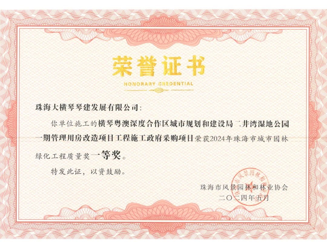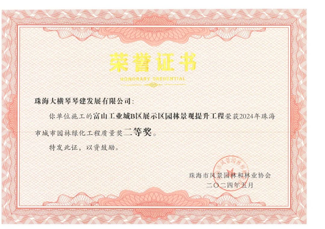 橫琴粵澳深度合作區(qū)城市規(guī)劃和建設(shè)局市政管理署2023年專(zhuān)類(lèi)公園綜合管養(yǎng)政府采購(gòu)項(xiàng)目、橫琴粵澳深度合作區(qū)城市規(guī)劃和建設(shè)局二井灣濕地公園一期管理用房改造項(xiàng)目工程施工政府采購(gòu)項(xiàng)目,榮獲2024年珠海市城市園林綠化工程質(zhì)量獎(jiǎng)一等獎(jiǎng)!富山工業(yè)城B區(qū)展示區(qū)園林景觀提升工程,榮獲2024年珠海市城市園林綠化工程質(zhì)量獎(jiǎng)二等獎(jiǎng)!