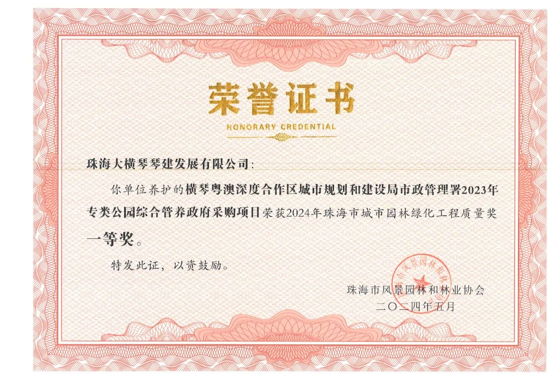 珠海市城市園林綠化工程質(zhì)量獎(jiǎng)是本市園林綠化工程類(lèi)的重要獎(jiǎng)項(xiàng),旨在提高景觀園林綠化建設(shè)的質(zhì)量和水平,評(píng)選出在全市具有引導(dǎo)和示范作用的景觀園林綠化優(yōu)秀工程及養(yǎng)護(hù)項(xiàng)目。本次獲獎(jiǎng),是珠海市風(fēng)景園林和林業(yè)協(xié)會(huì)對(duì)大橫琴集團(tuán)管養(yǎng)項(xiàng)目、施工項(xiàng)目與代建項(xiàng)目品質(zhì)的認(rèn)可與鼓勵(lì)。同時(shí)也是大橫琴集團(tuán)在貫徹落實(shí)市委、市政府關(guān)于“綠美珠海生態(tài)建設(shè)”工作部署中取得的階段性成效。