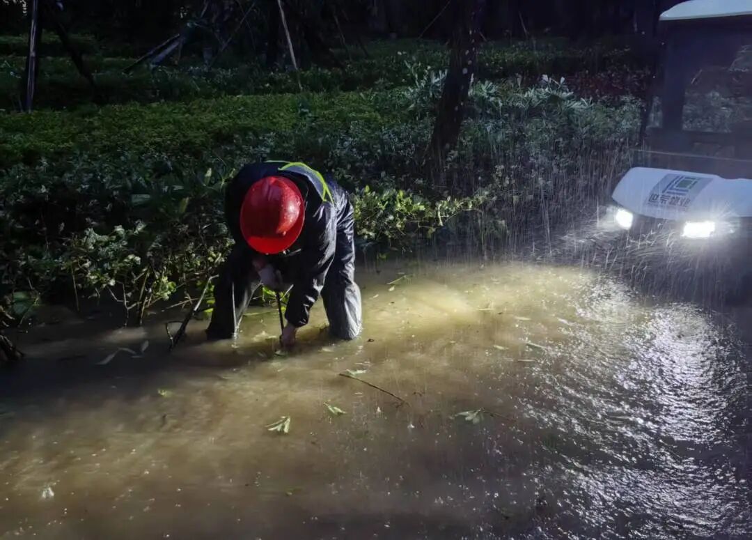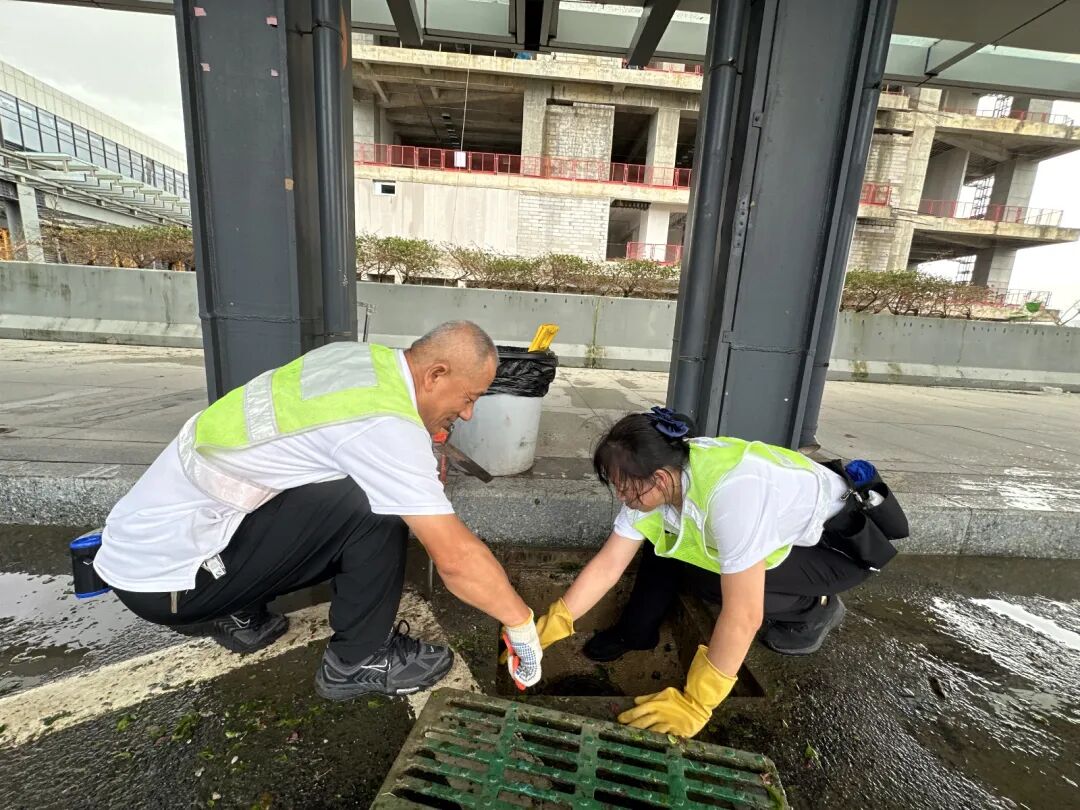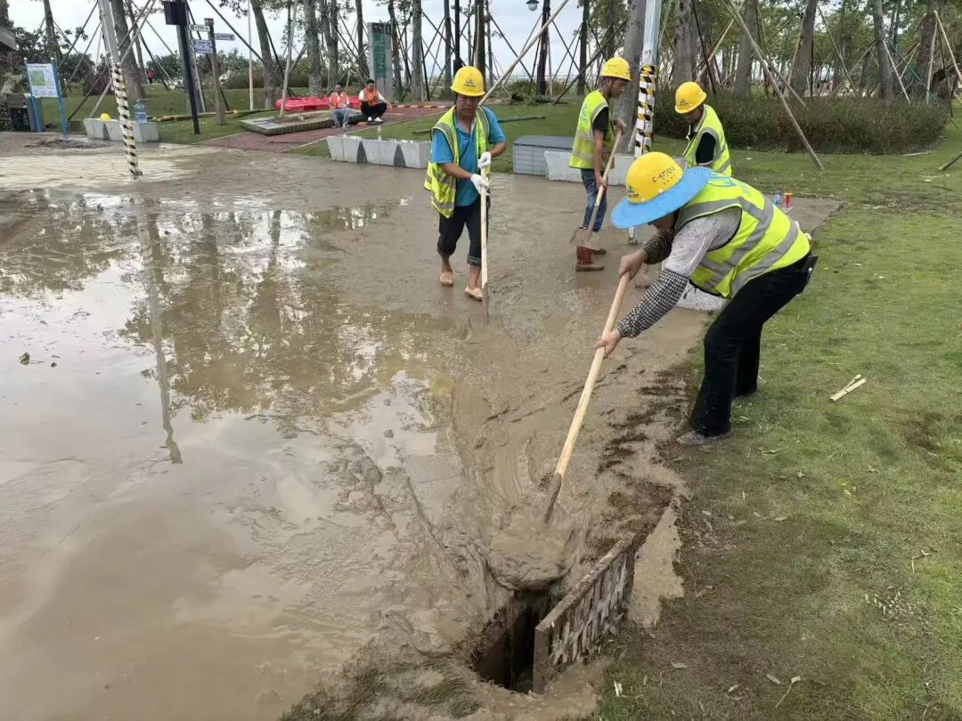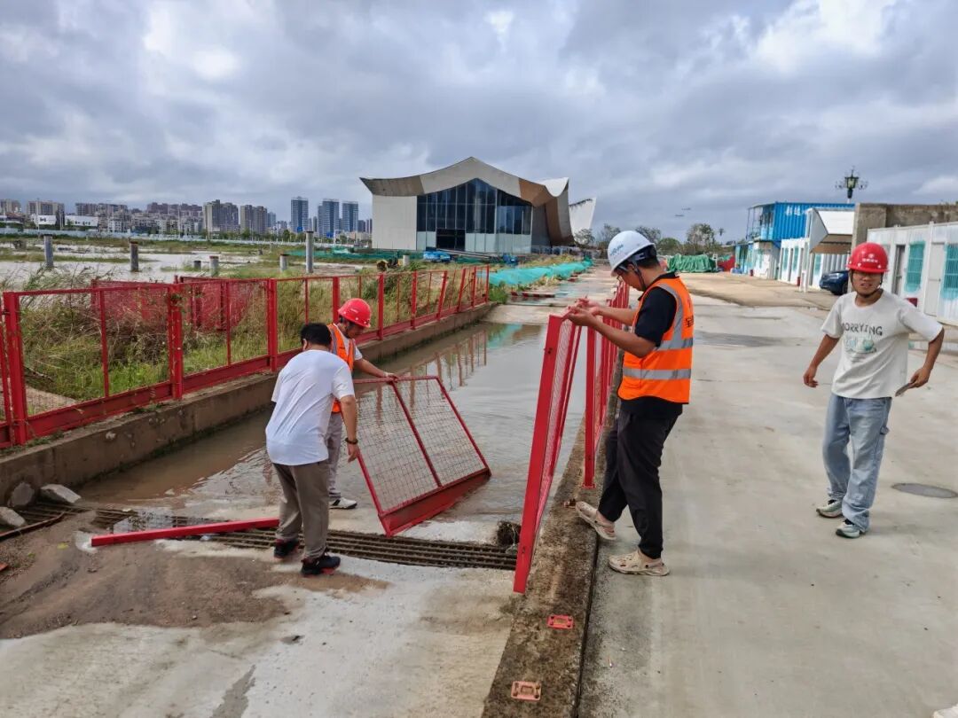 臺(tái)風(fēng)期間,受風(fēng)暴潮影響,橫琴天沐河水位上漲,珠光集團(tuán)迅速組織搶險(xiǎn)力量,通過加筑沙袋有效阻止海水倒灌進(jìn)天沐河,同步安全轉(zhuǎn)移設(shè)備設(shè)施,并緊急安裝抽水設(shè)備清理積水,避免變電房被水浸泡。臺(tái)風(fēng)過境后,搶險(xiǎn)隊(duì)伍立即投入后續(xù)清理工作,第一時(shí)間清理泵站進(jìn)水口垃圾,保障泵站排水通暢,降低村渠水位;清理排水口垃圾,保障土渠排水暢通;并全力協(xié)助合作區(qū)市政管理署,清理倒塌的邊境圍網(wǎng)。